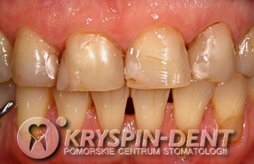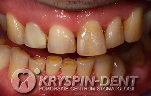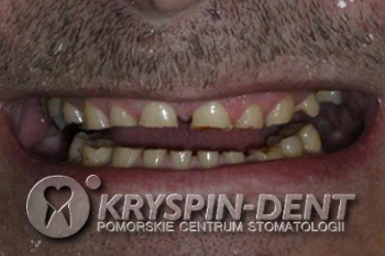 Pacjent miał bardzo krzywe i starte zęby. Ponadto na górze i na dole brakowało kilku zębów. Problemem była również choroba przyzębia, która była przyczyną stanu zapalnego i krwawienia dziąseł. Bardzo ważne dla Pacjenta było uniknięcie zaawansowanych zabiegów chirurgicznych (wstawienie implantów).